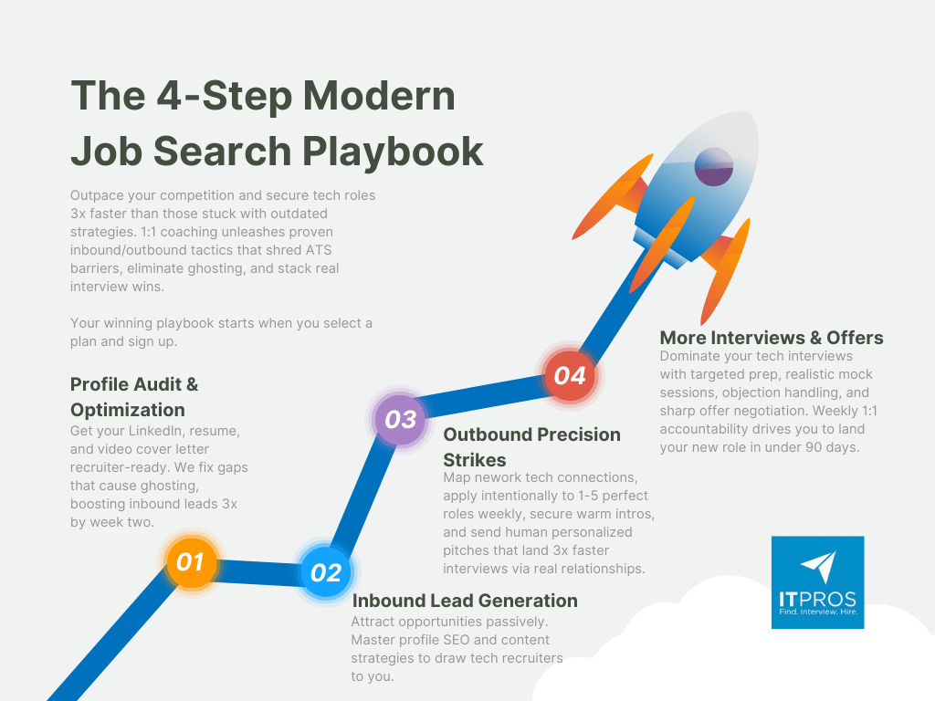 IT Pros combines the market access of an elite recruiting firm with the dedicated, 1:1 strategy of a personal career coach.